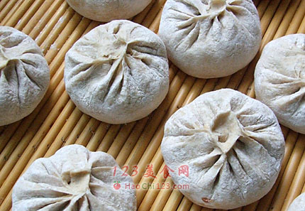 7、随自己熟悉得手法,捏成圆包子状,收口处捏紧;全部包好的包子盖上厚布,进行二次饧发。