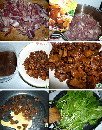 5、热锅,加入鸡蛋跟鸡胗稍微炒下,不用加任何料了,因为卤料已经很够味了哦。