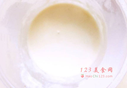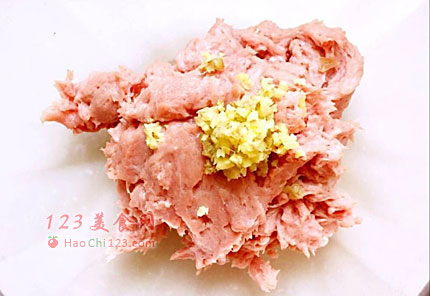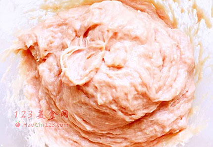 3、把面糊倒入猪肉泥中搅拌均匀;再加一个鸡蛋清、少许油、盐,沿着同一个方向搅拌到上劲。