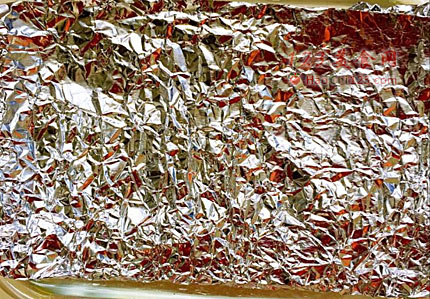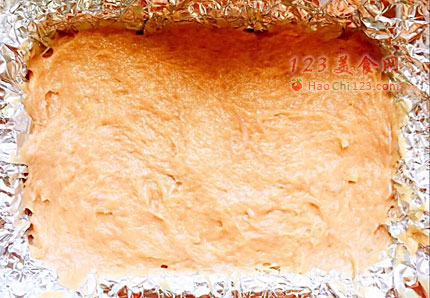 4、长方形容器,铺一层锡纸,搅好的肉馅倒入整平。