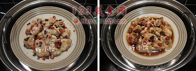 3、焯水后的鸡翅加生抽、料酒和几滴醋拌匀,表面撒上豆豉,切片的蒜,切圈的干红辣椒,盐、糖。