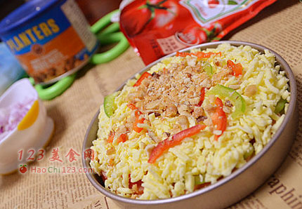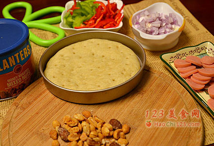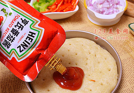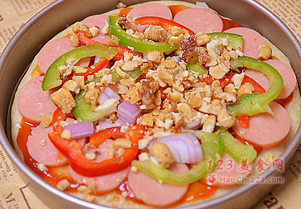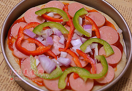 4、火腿片均匀摆在番茄酱上面。撒入圆葱碎,青红椒丝。