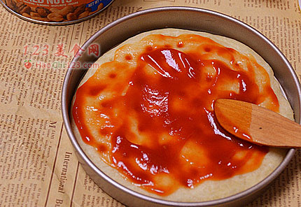 2、番茄酱均匀涂抹在面饼上,爱吃这个味道的可以涂厚一点。