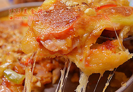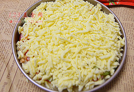 6、均匀的铺上一层马苏里拉奶酪,这种要买披萨专用的,不然拉丝效果不好。