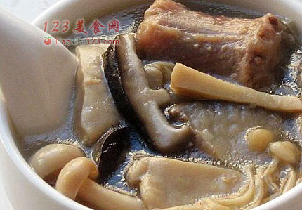 4、放入这八种蘑茹,加盐、少许糖、酱油、料酒,炖两个小时。