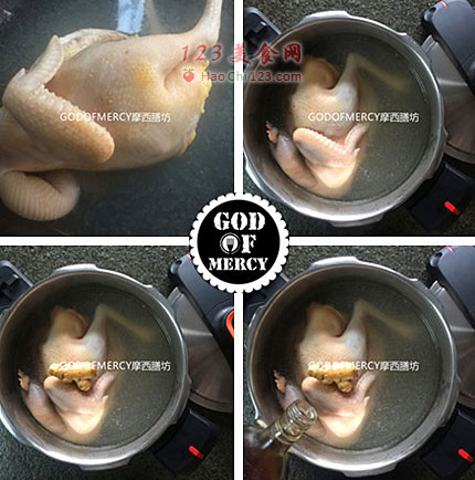 6、焯水后的老母鸡放进高压锅中。