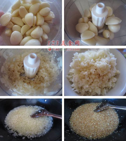 2、油锅烧热到七成以上,下大蒜粒炸到金黄捞起,市场上也有现成的台湾炸蒜酥卖,但自家做的更酥脆,炸过蒜的油炒菜特别香。