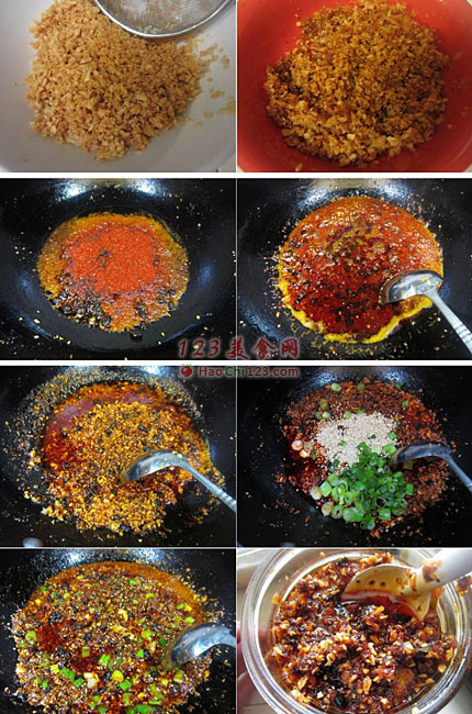 4、油锅里放宽油,大火烧热后转小火下豆豉和辣椒末,辣椒粉炒香,下炸好的蒜酥炒匀,辣椒粉给酱酱上色,辣椒末儿有香味有口感,我总是一起放,另外,如果放点油葱酥味道会更香。