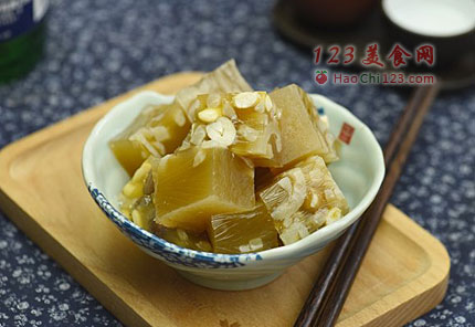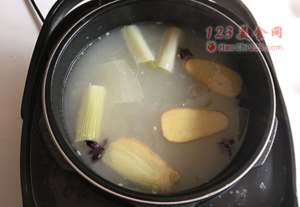 5、开启电压力锅肉/鸡这个功能(这个功能完成,猪皮就被煮的软软的了,如果没有这个功能,或者不是用的电压力锅,记得煮好了尝尝猪皮是否煮好)。工作完成,将葱、姜、八角取出(煮好就捞出来,不然做成皮冻凝固到里面,你就要一起吃掉了有料的皮冻更好吃——花生黄豆猪皮冻)。