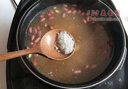 6、放入泡好的黄豆(黄豆提前浸泡,洗净再放,还有不要在熬猪皮的时候放,这个煮10分钟左右即可,不能煮太久);放入泡好的花生(花生提前浸泡,洗净再放,还有不要在熬猪皮的时候放,这个煮10分钟左右即可,不能煮太久)。
