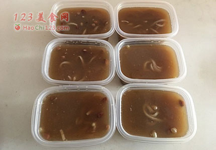 9、煮好了。将它晾凉(我为了晾的快,倒进大盆里面,晾好再装一次性餐盒),装入餐盒,这个完全可以用盆直接冷,我是为了送人方便,装了小盒,给婆婆、妈妈分分。