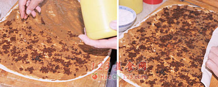4、撒好红糖之后,沿着一边顺时针卷起来。