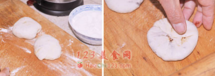 8、把整形好的小面团,压扁,如图。