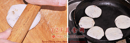 10、平底锅,锅中不用放油,把擀好的饼放入锅中,中小火盖上盖子烙制。