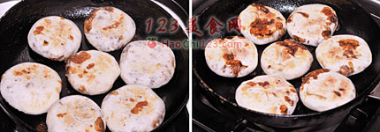 6、用中小火烙制火烧,两面金黄色,糖溢出来就可以了。[LaoYanHuo.com]