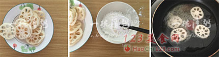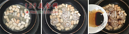 8、豆腐块变成金黄色后,放入藕片。
