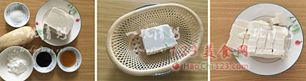 7、豆腐块也是用同样的方法,裹上一层淀粉后炸。