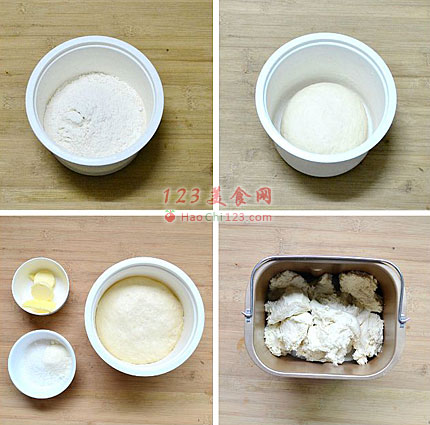 1、将发酵好的中种面团撕成小块,加入除黄油外的主面团材料一起放入面包机里。