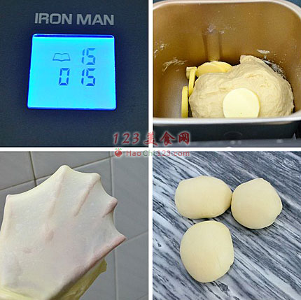 2、面包机揉面程序15分钟后加入黄油,再调一个揉面程序再揉15分钟至完全的可拉出大片薄膜的阶段。