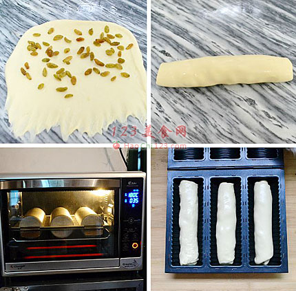 3、揉好的面团均分成三份,擀成打横长方形,拖薄底边,放入适量的葡萄干,再由上往下卷成圆柱形,整形入模(具体方法看细节图哈)。
