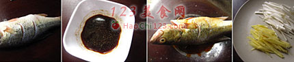 2、葱姜切成丝,塞入鱼肚,腌制30分钟。