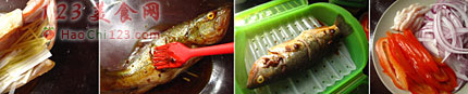 4、将洋葱、红甜椒、五花肉切成丝铺在鱼身上。
