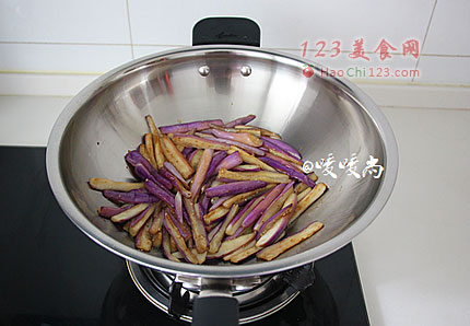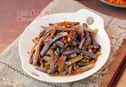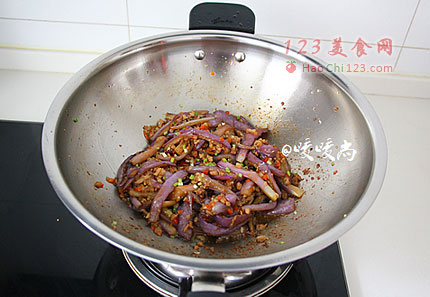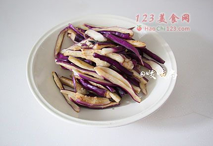 4、炒锅内放多一点的花生油,下攥干水分的茄条中小火煸至茄条变软盛出备用。