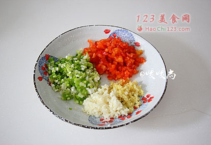 2、香葱、大蒜、姜片切末,红彩椒切丁。