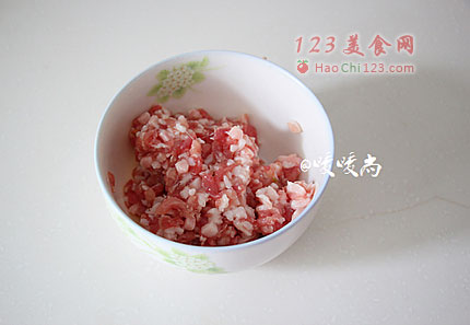 3、五花肉切丁,加盐半克、玉米淀粉和黄酒抓匀腌制15分钟。