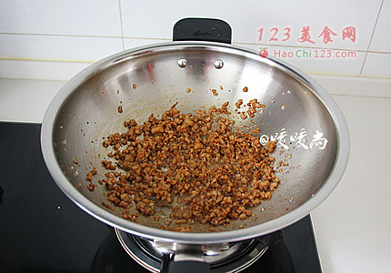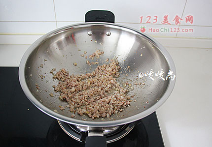 5、利用锅底的余油,下将蒜末炒出香味。下腌制后的肉末快速翻炒至肉末变色。