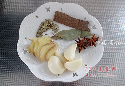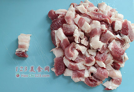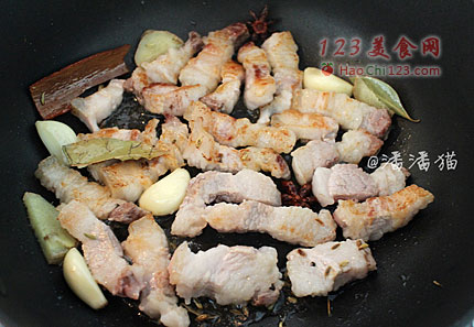 3、五花肉不用焯水,直接放入锅内煸炒直至肉变色,煸出香味后放入增香辅料一同煸。