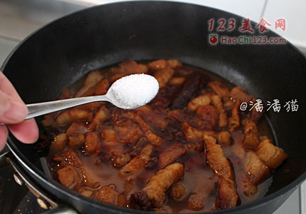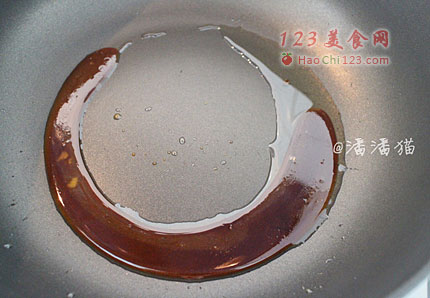 5、把煎好的肉盛出,锅里留一点点底油。放入冰糖用小火炒糖色。待冰糖融化,成浅褐色,糖色就炒好了。此时立刻让入肉翻炒,让肉裹上糖。