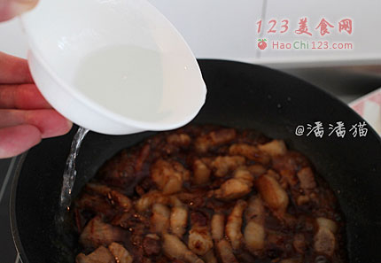 6、在肉锅中烹入料酒和酱油。再放入一小碗水,盖上锅盖焖烧15分钟。