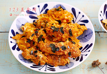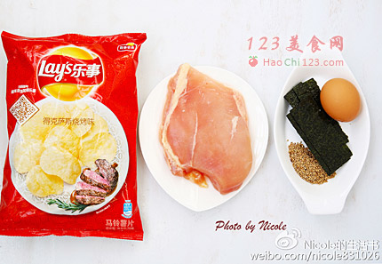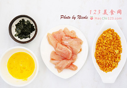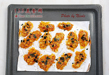 5、表面撒上海苔碎和白芝麻,烤箱180度预热10分钟,放入鸡柳烤15分钟左右。