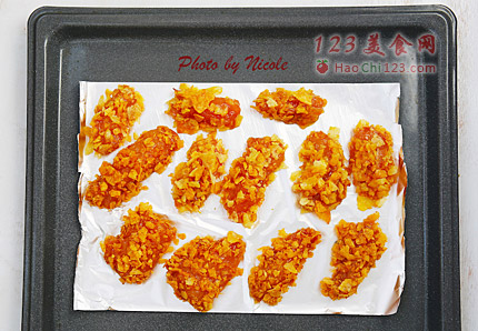 4、烤盘中放入锡纸,再放入沾满薯片的鸡柳。