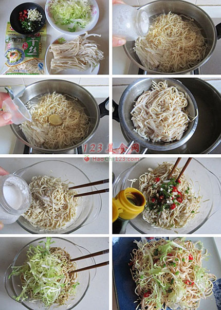 2、煮好后捞出放入碗中,先放入盐和小麻油搅拌均匀;待温度稍微下下来后再加入蒜末和小葱末等调味料。