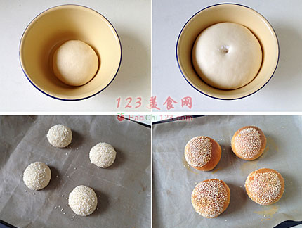 8、表面刷蛋液,沾一层白芝麻,放在烤盘中,放置温暖湿润处进行二次发酵,二次发酵结束后,放入180度预热的烤箱,中层,上下火,15分钟左右,取出晾凉待用。