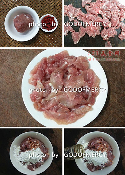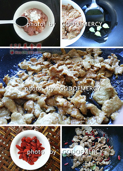 8、油热后下肉片滑散。肉片炒到划散变色4成熟时捞出沥干油。