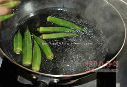 2、做一锅水,水开之后放入清洗好的秋葵,焯3-5分钟即可,千万别焯过头啊。