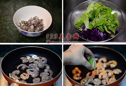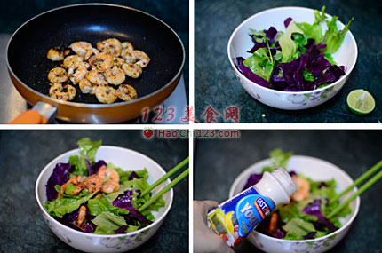 7、虾仁一起放入蔬菜中,拌匀尝下味道,需要可再调入盐和黑胡椒,柠檬汁。