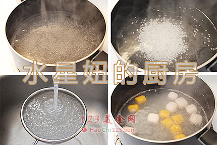 4、煮芋圆:锅里加水煮开,把芋圆和地瓜圆加进去,不停地搅拌,直到圆丁都浮到面上,再继续煮1-2min即可捞出备用。