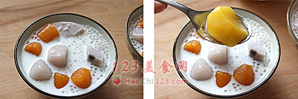 5、将芋圆、西米分别盛进碗里,倒上温热的牛奶,再加上几片糖水黄桃即可享用。