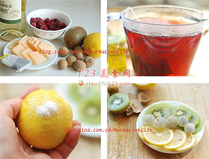 4、桂圆去壳,猕猴桃去皮切片,柠檬切片,哈密瓜切片备用。