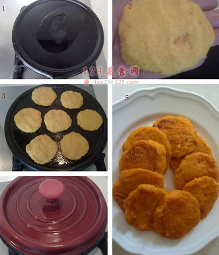 3、不追求外观,也可用勺子舀一勺面糊直接放到锅内稍压,更随意。也可烙成一张大饼。[LaoYanHuo.com]