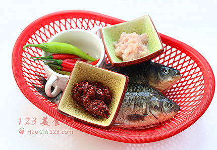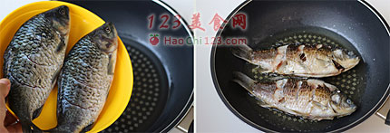 3、锅中加入适量的油,放入鲫鱼煎至双面变色捞出备用。