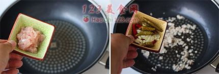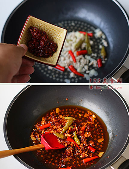 4、锅中留底油,加入绞肉、蒜片、红辣椒、小米辣椒、蒜片炒香后加入皮蛋豆瓣炒出红油。
