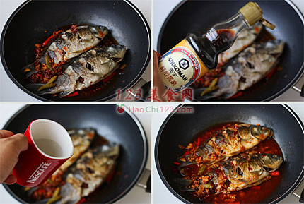 5、加入鲫鱼后加入少许酱油、100毫升水,少许鸡粉,转中火收汁即可。