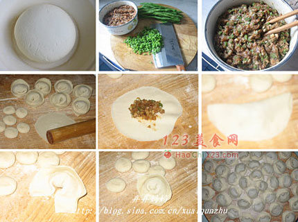 2、和擀饺子皮的方法一样,擀成很薄的面皮,包入适量的馅儿料,对折成半圆。