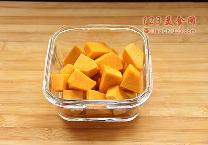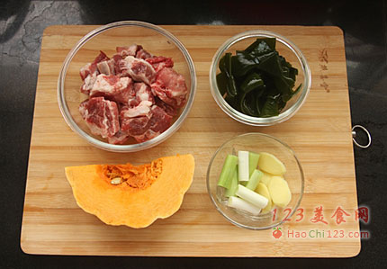 2、南瓜洗净,去皮去籽,切成块。海带结洗净,备用。