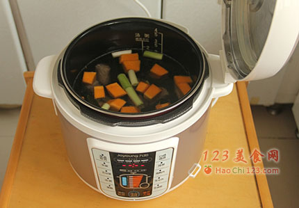 1、若用普通汤锅或汤煲来做,将所有原料放入锅内,加水用大火煮沸,撇去浮沫,再转中小火熬至排骨软烂,出锅前加盐调味即可。